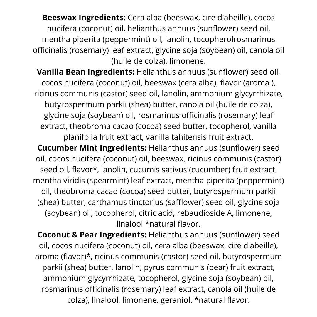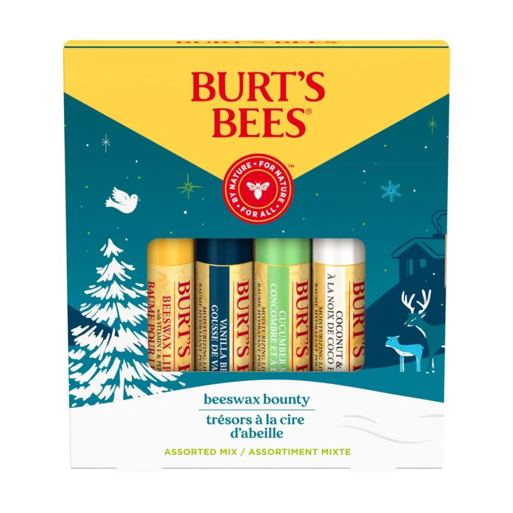 Burt’s Bees Beeswax Bounty Assorted Mix Lip Balm Gift Set includes four tubes of moisturising lip balms in Coconut & Pear, Cucumber Mint, Vanilla Bean and Beeswax flavours. Each lip balm is 100% natural origin and power packed with Beeswax, antioxidant-rich vitamin E and other ingredients to condition, moisturize and soften dry lips.